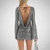 Deze zilveren pailletten mini jurk met open rug is een echte eyecatcher voor feestjes en avondjes uit. De diepe open rug met striksluiting en lange mouwen geven een elegante en glamoureuze look, terwijl de glanzende pailletten zorgen voor een schitterende afwerking.