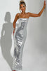 Deze zilveren lange paillettenjurk is een glamoureuze keuze voor gala’s, feesten en speciale gelegenheden. Het aansluitende ontwerp met rechte halslijn en spaghettibandjes benadrukt het silhouet en laat je stralen dankzij de all-over glanzende pailletten.