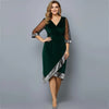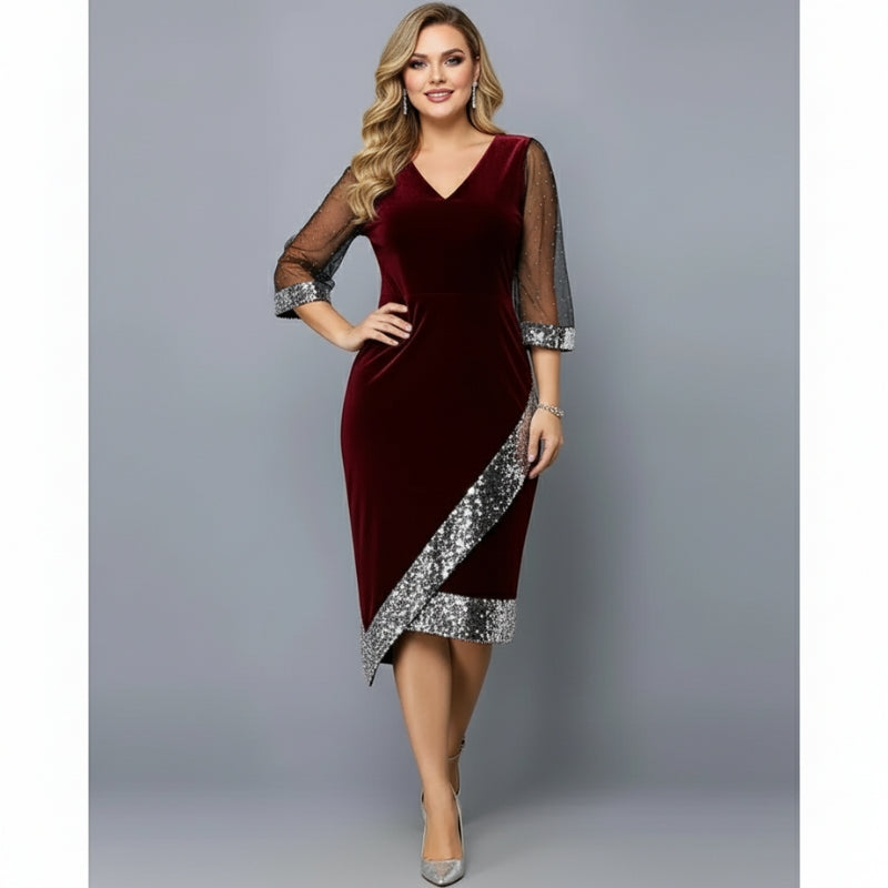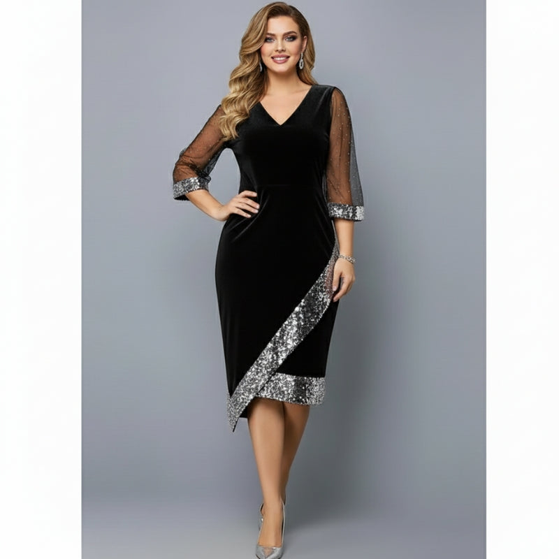 Deze glitterjurk met tule mouwen is perfect voor chique diners en formele evenementen. De elegante V-hals en asymmetrische paillettenzoom geven de jurk een verfijnde en feestelijke uitstraling.